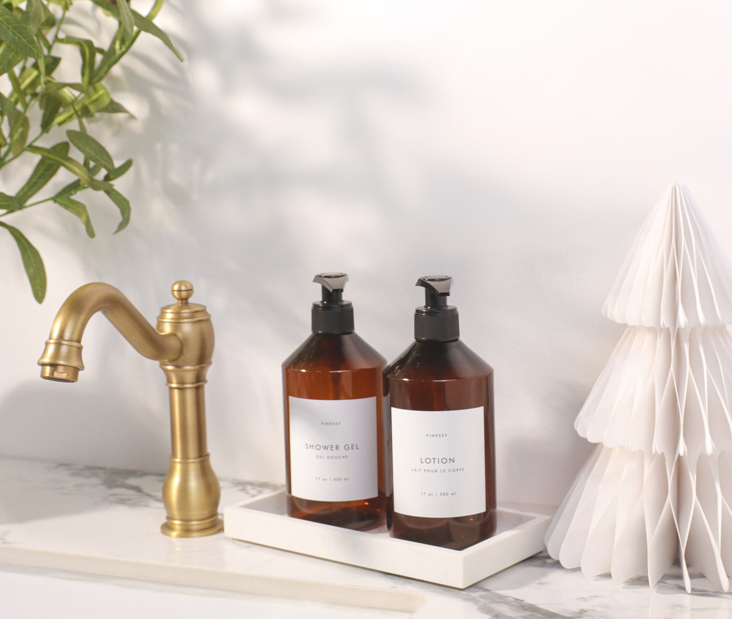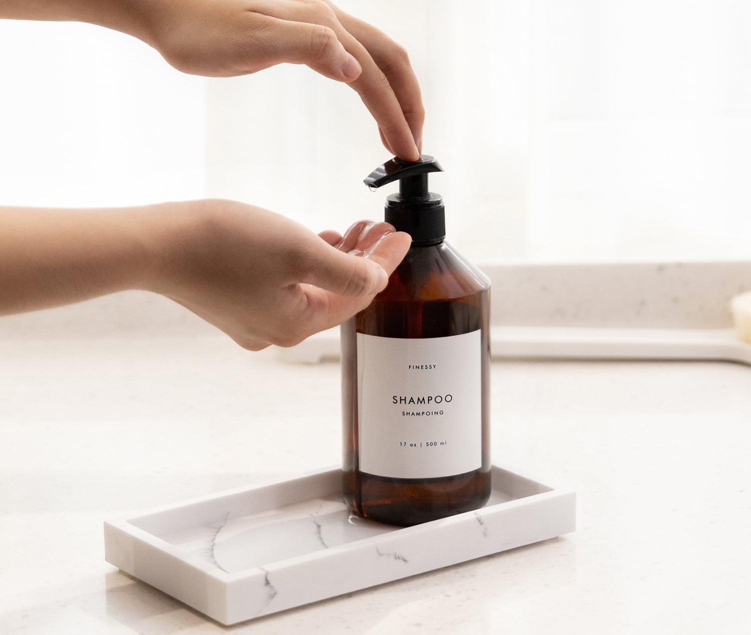 Sturdy marble tray keeps your dispenser set stable and hygienic in the sink area while adding a touch of elegance. Pair your bottles with 18 minimalist, waterproof labels to create a perfectly organized, stylish space.